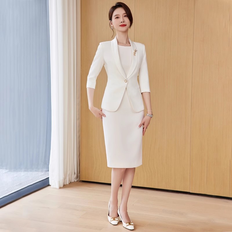白色西装外套女秋季气质修身显瘦西服七分袖职业套装连衣裙两件套