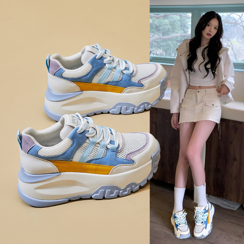2025夏季新款老爹鞋百搭厚底拼色松糕鞋小个子34码蓝色运动鞋女鞋