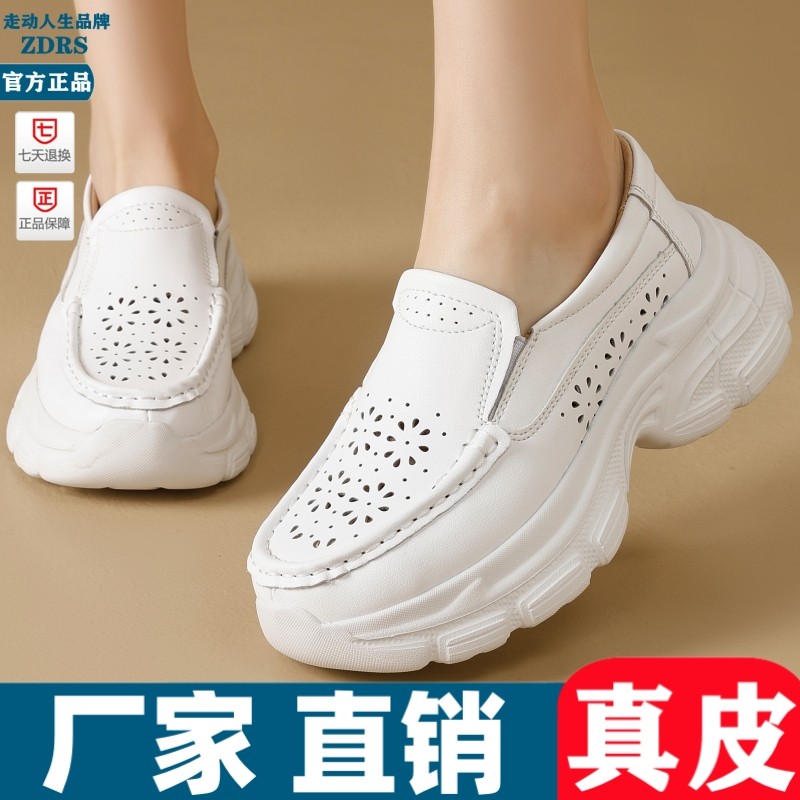 真皮小白鞋女春夏季新款厚底女鞋34码松糕鞋软底一脚蹬镂空护士鞋