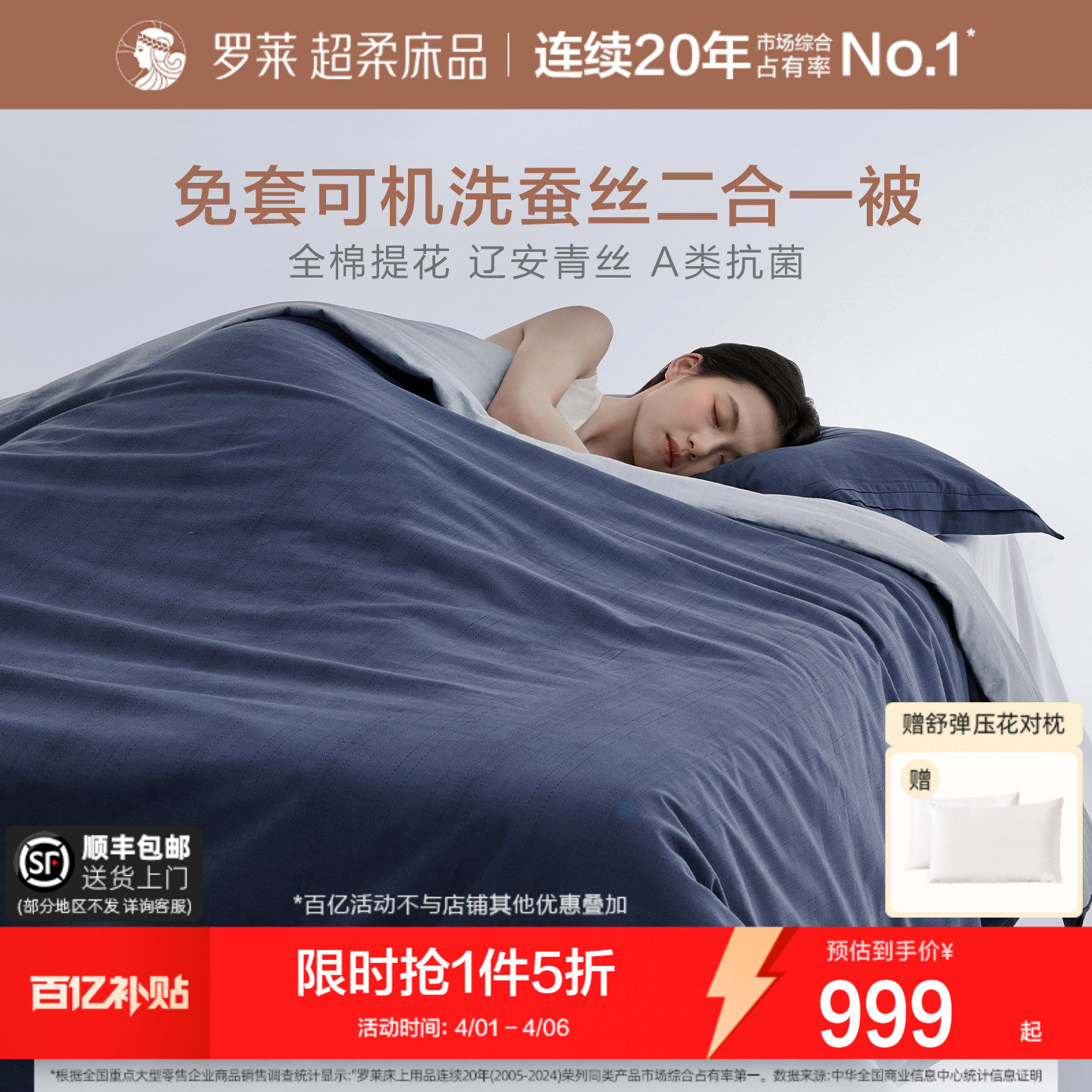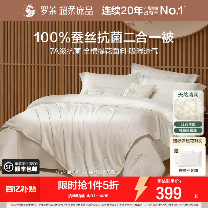 罗莱家纺60s全棉100桑蚕丝春秋被子结婚二合一子母被芯抗菌夏凉被