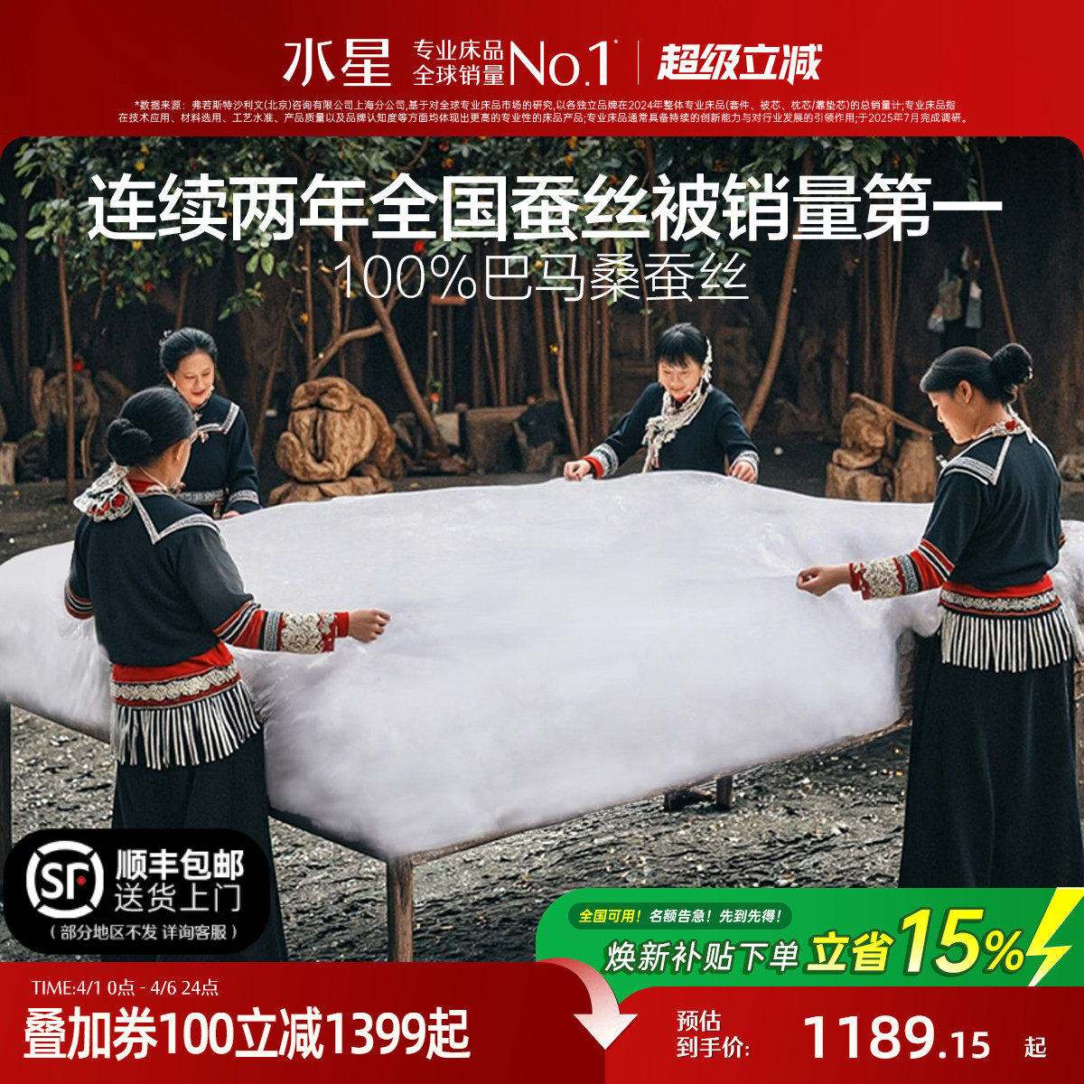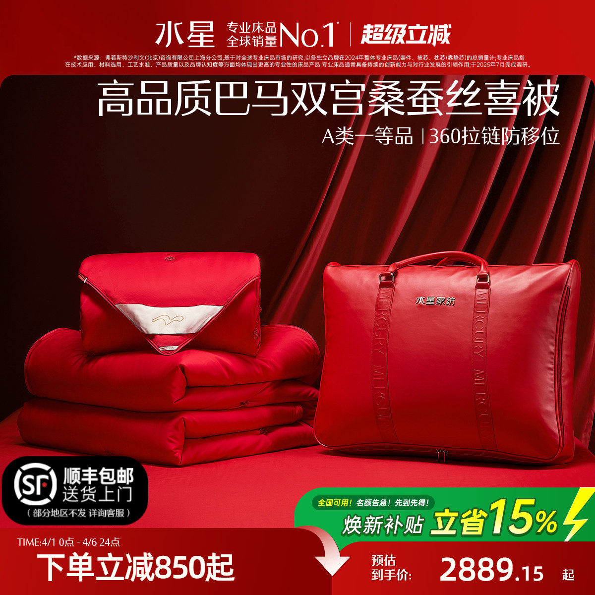 水星家纺100支长绒棉巴马桑蚕丝被结婚子母被双宫茧高端喜被陪嫁