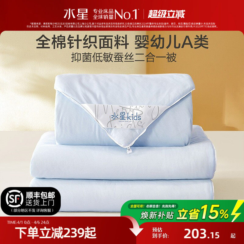 水星家纺母婴A类全棉低敏蚕丝被儿童春秋被芯四季通用子母被冬被