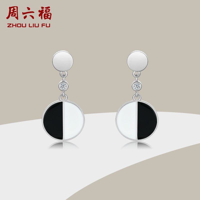 周六福S925黑白圆牌造型纯银耳钉个性撞色时尚几何简约清新复古风