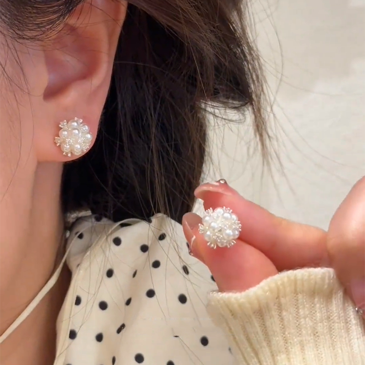 纯银耳钉个性洋气甜美米珠花球优雅气质独特设计感显温柔耳饰百搭