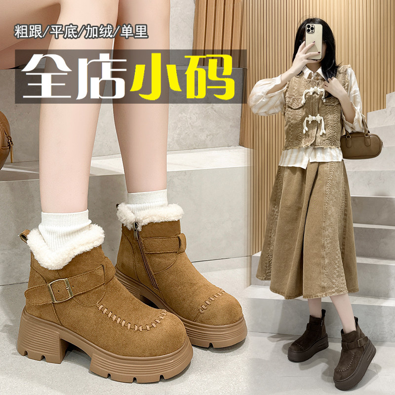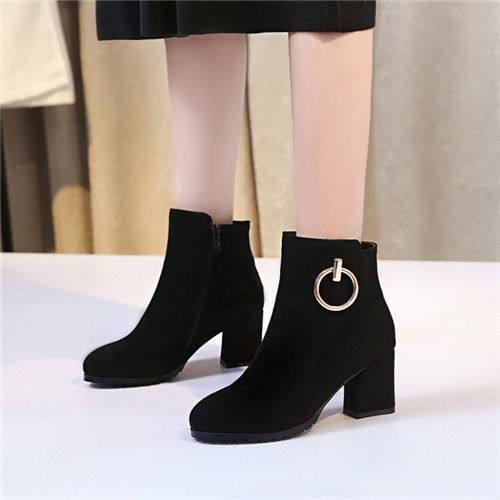 - 短靴女冬加绒粗跟