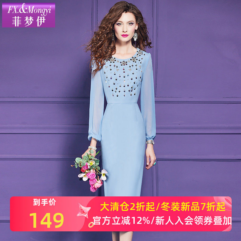菲梦伊亮片蓝色连衣裙女长袖秋季重工优雅高端轻熟气质包臀一步裙