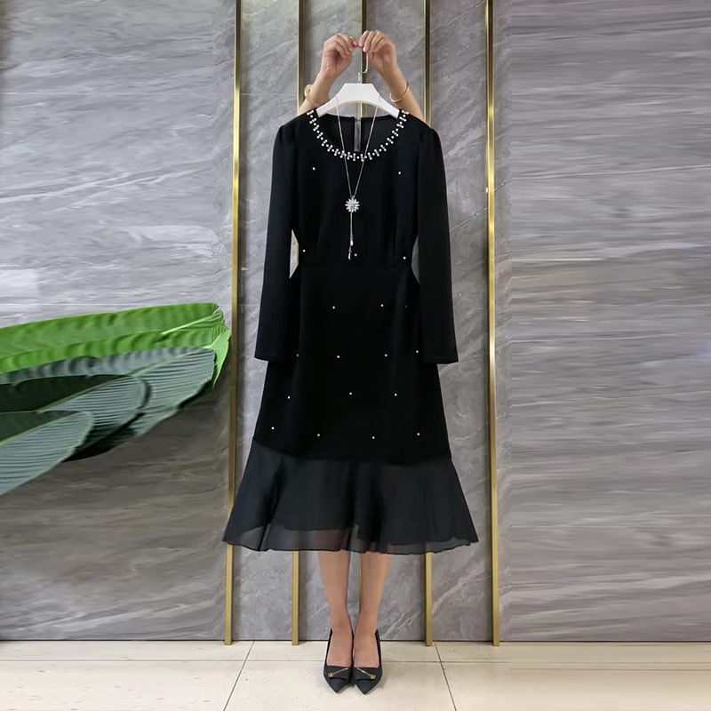 胖妹妹钉珠领长袖连衣裙法式气质轻熟风长款大码女装洋气黑色裙子