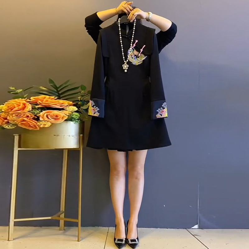 胖妹妹法式洋气大码女装时尚显瘦立领盘扣刺绣复古风长袖连衣裙潮