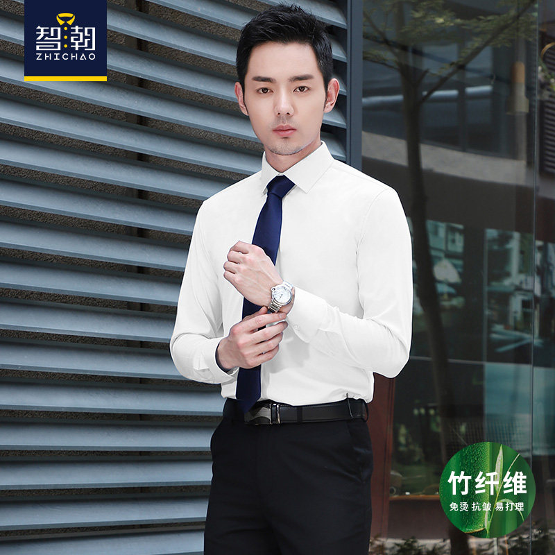 白衬衫男长袖免烫竹纤维商务职业工装绣LOGO定制弹力抗皱西装衬衣