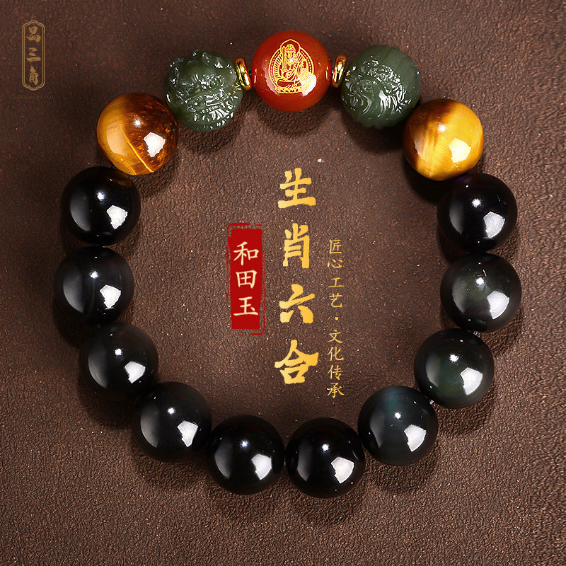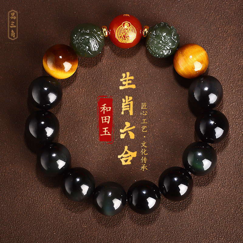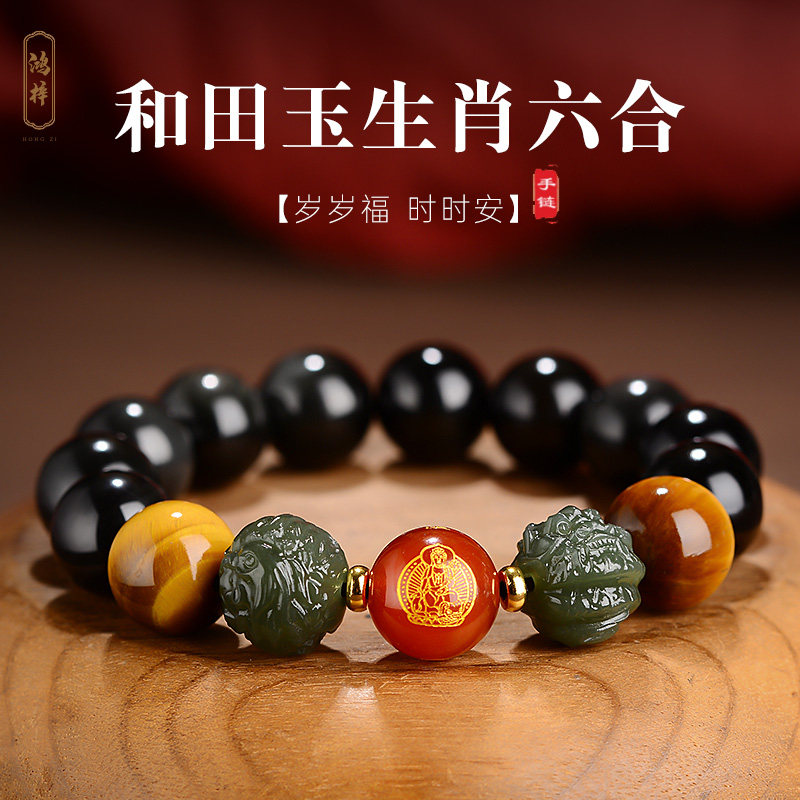 和田玉六合生肖龙鸡手链黑曜石手串佛珠本命年男女本命佛普贤菩萨