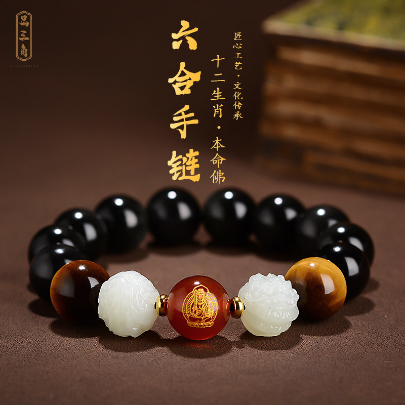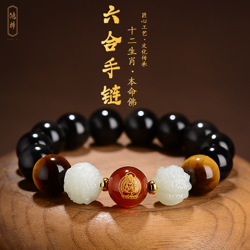 和田玉六合生肖龙鸡本命年手链黑曜石手串佛珠男女本命佛普贤菩萨