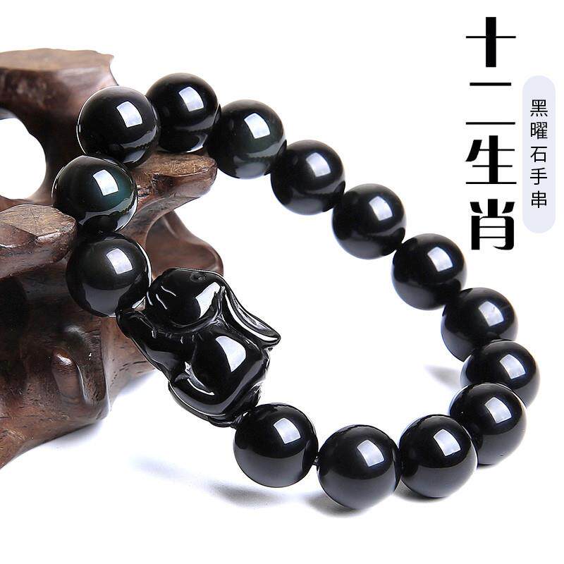 天然黑曜石十二生肖老鼠鸡狗牛猪手链男款本命年属蛇手串兔子女士