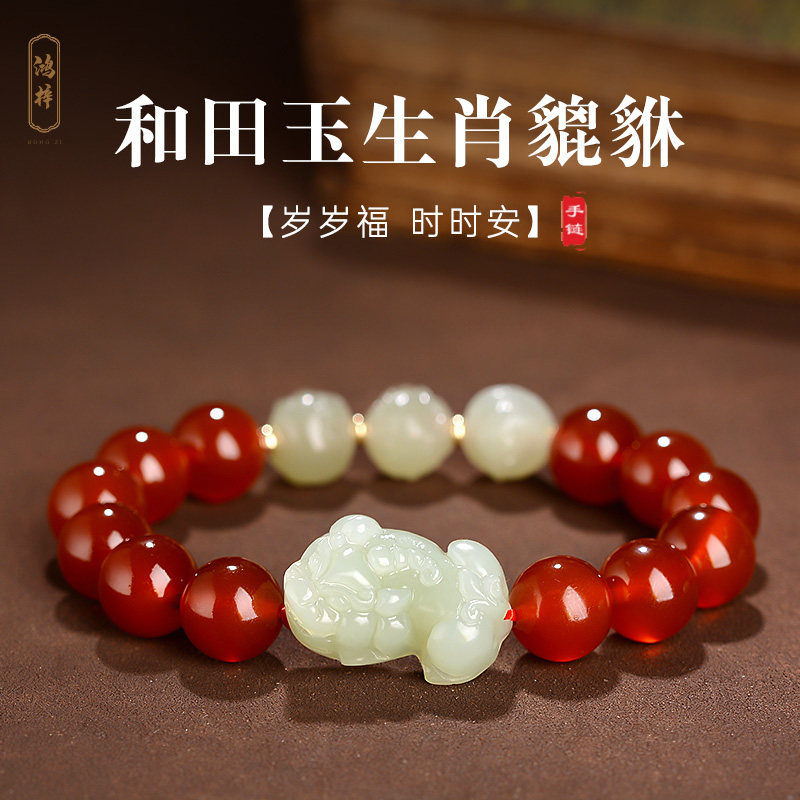 本命年十二生肖蛇鸡牛情侣红玛瑙手串和田玉貔貅佛珠手链男女礼物