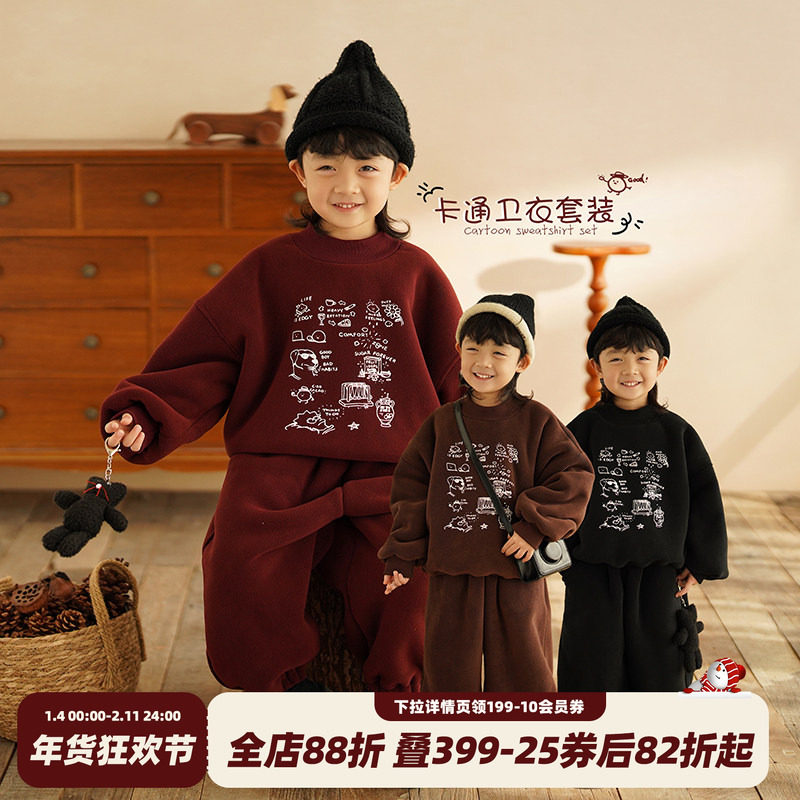 砚台家男童加绒卫衣套装宝宝卡通两件套儿童运动卫裤保暖冬季新款