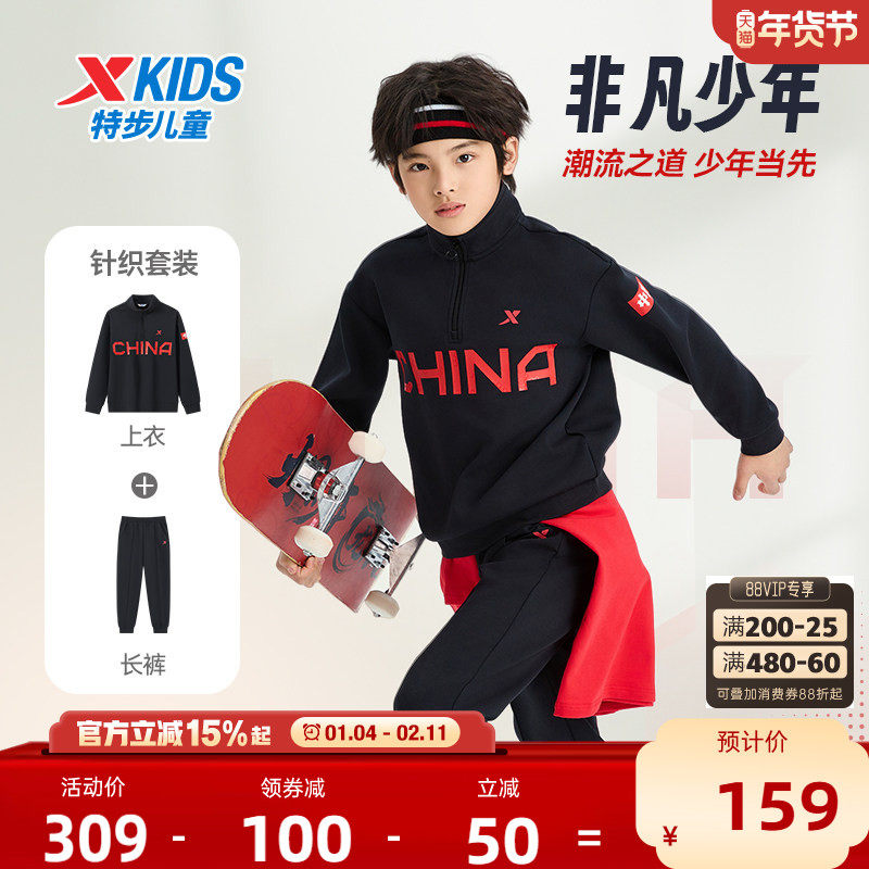 特步童装男童长袖国潮套装2025冬季儿童立领卫衣长裤两件套运动服