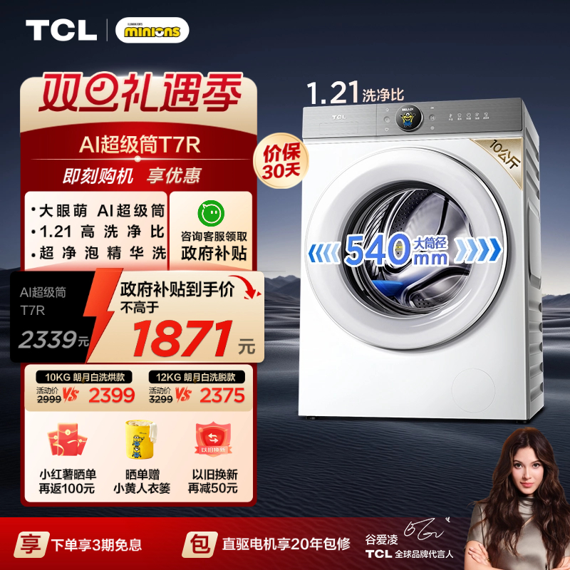 TCL大眼萌AI超级筒T7R洗烘一体10/12KG滚筒洗衣机全自动家用国补