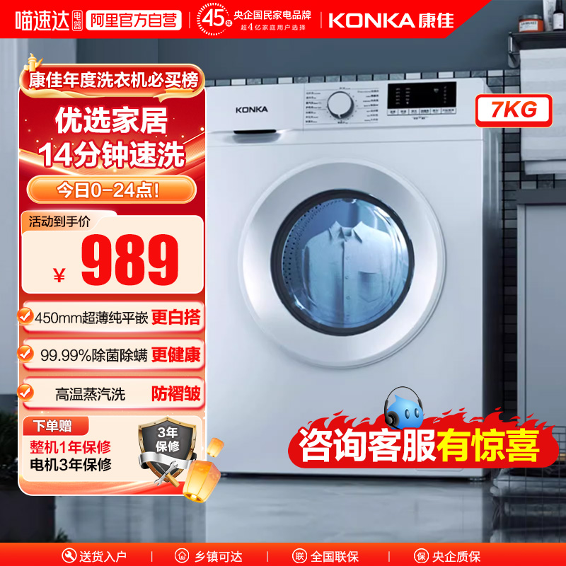 康佳7kg滚筒洗衣机全自动家用大容量除菌超薄嵌洗脱一体一级能效