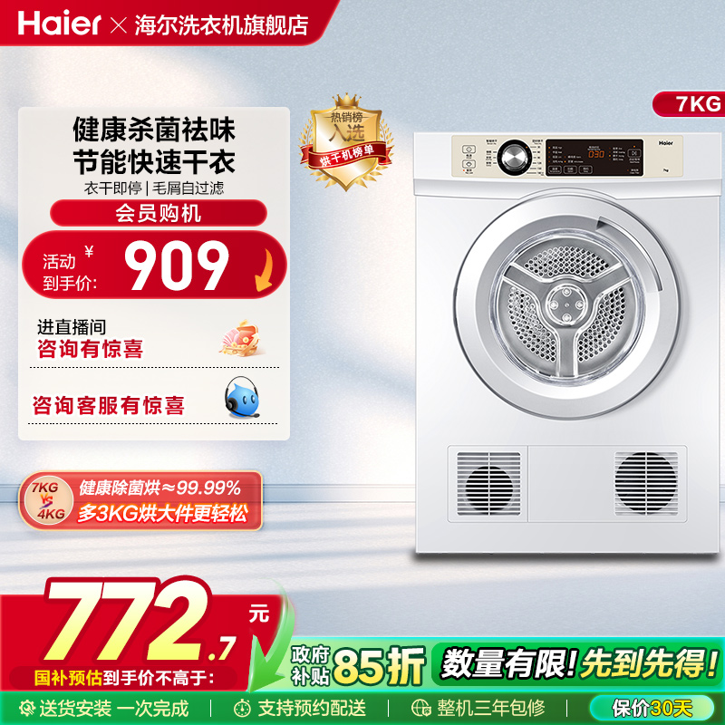 海尔烘干机7kg全自动家用直排滚筒式小型除菌迷你干衣机宿舍7F