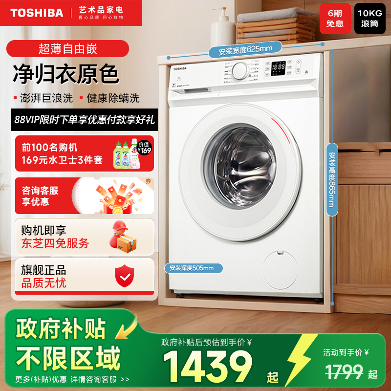 【国补不限地区】东芝小白桃超薄洗衣机7KG全自动变频滚筒洗衣机