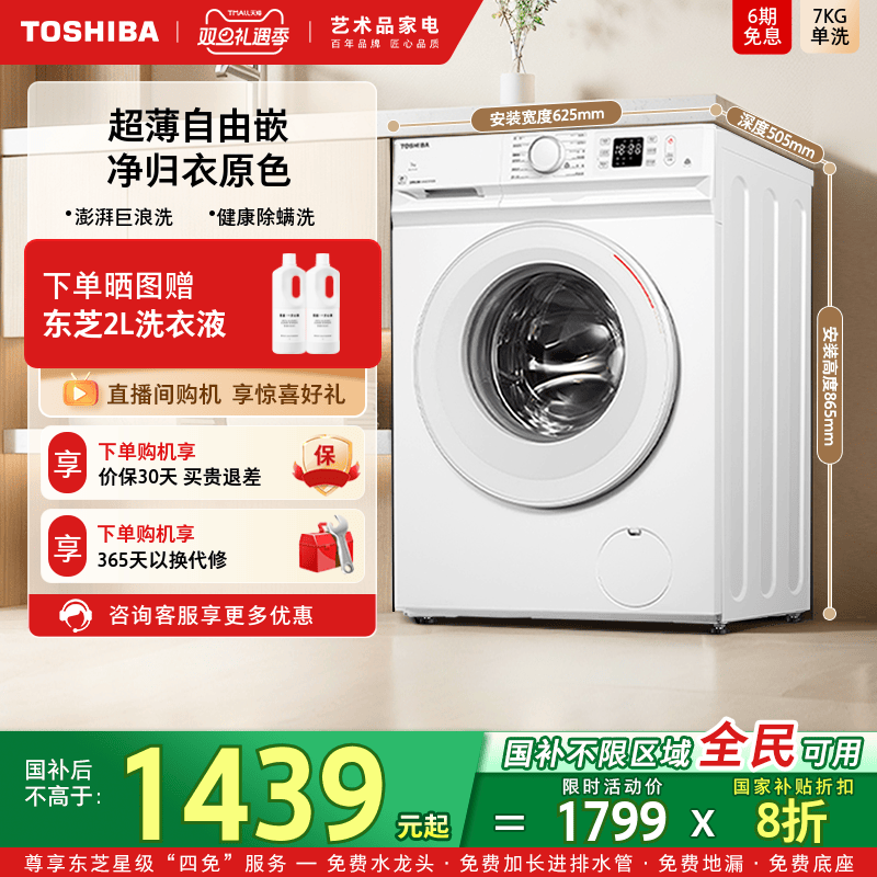 [国补不限地域]东芝小白桃7KG超薄小型全自动滚筒洗衣机以旧换新