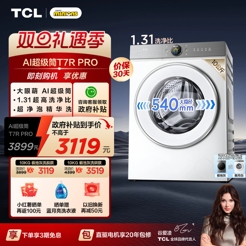 TCL大眼萌AI超级筒T7R PRO洗烘一体10KG滚筒洗衣机家用全自动国补
