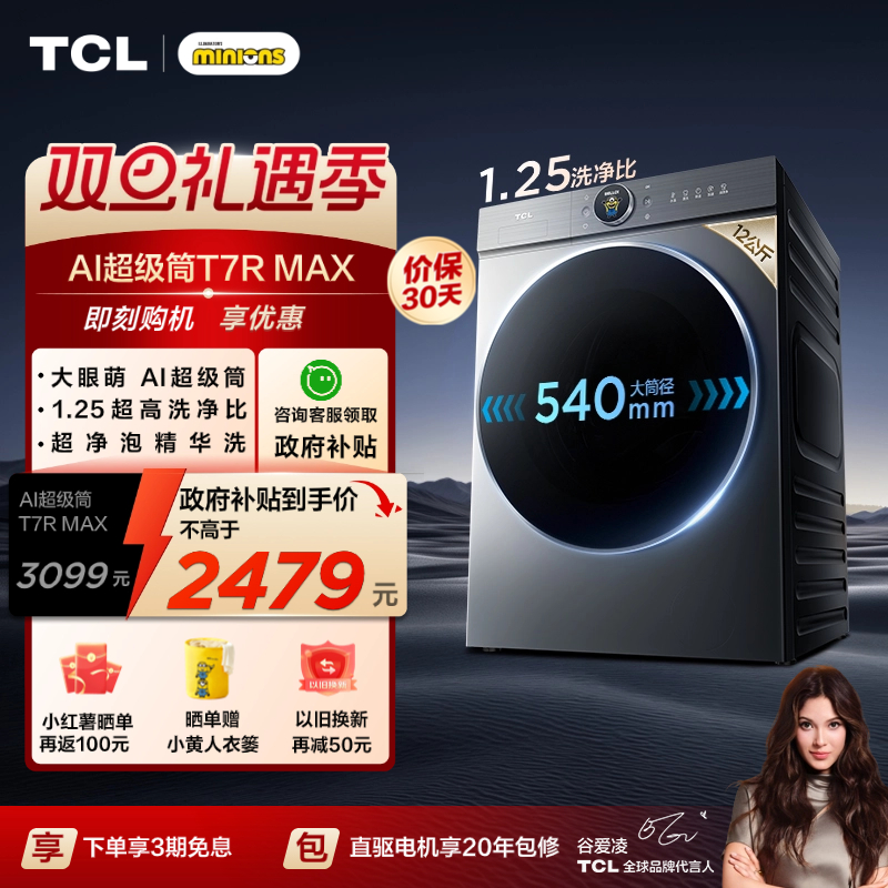 TCL大眼萌AI超级筒T7R Max12KG滚筒洗衣机全自动家用以旧换新补贴