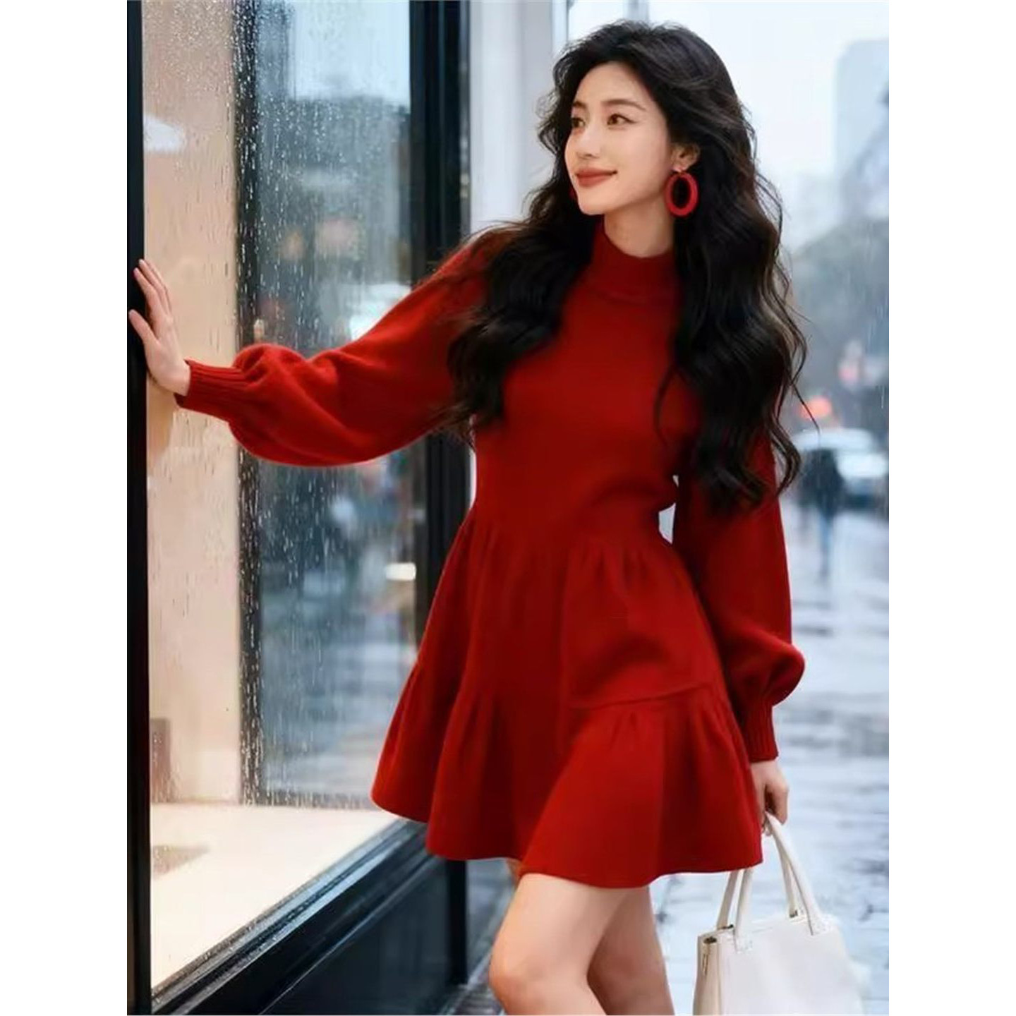 韩国高级感新年红色针织连衣裙女春装新款气质收腰显瘦礼服A字裙