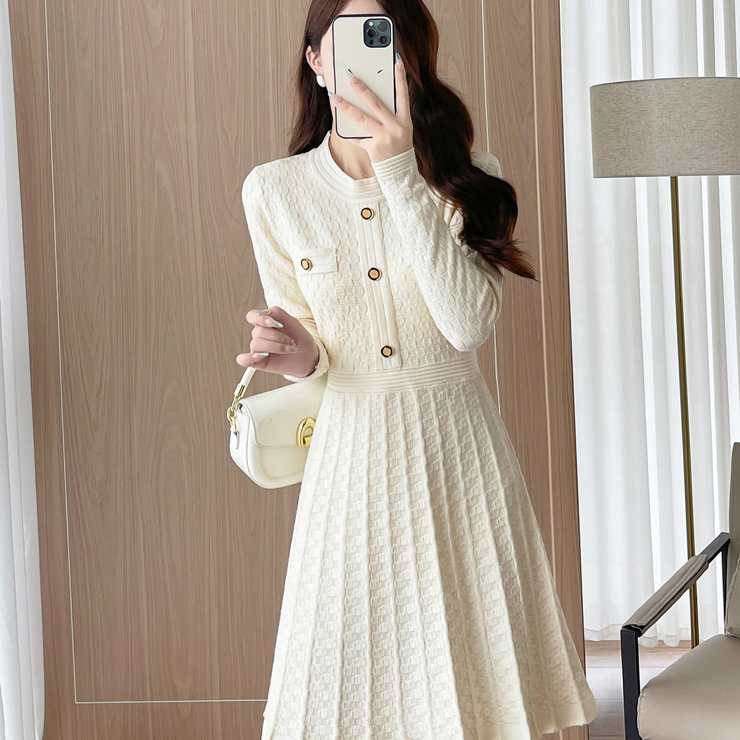 小香风针织连衣裙女春装洋气遮肚子显瘦收腰长袖A字打底毛衣裙子