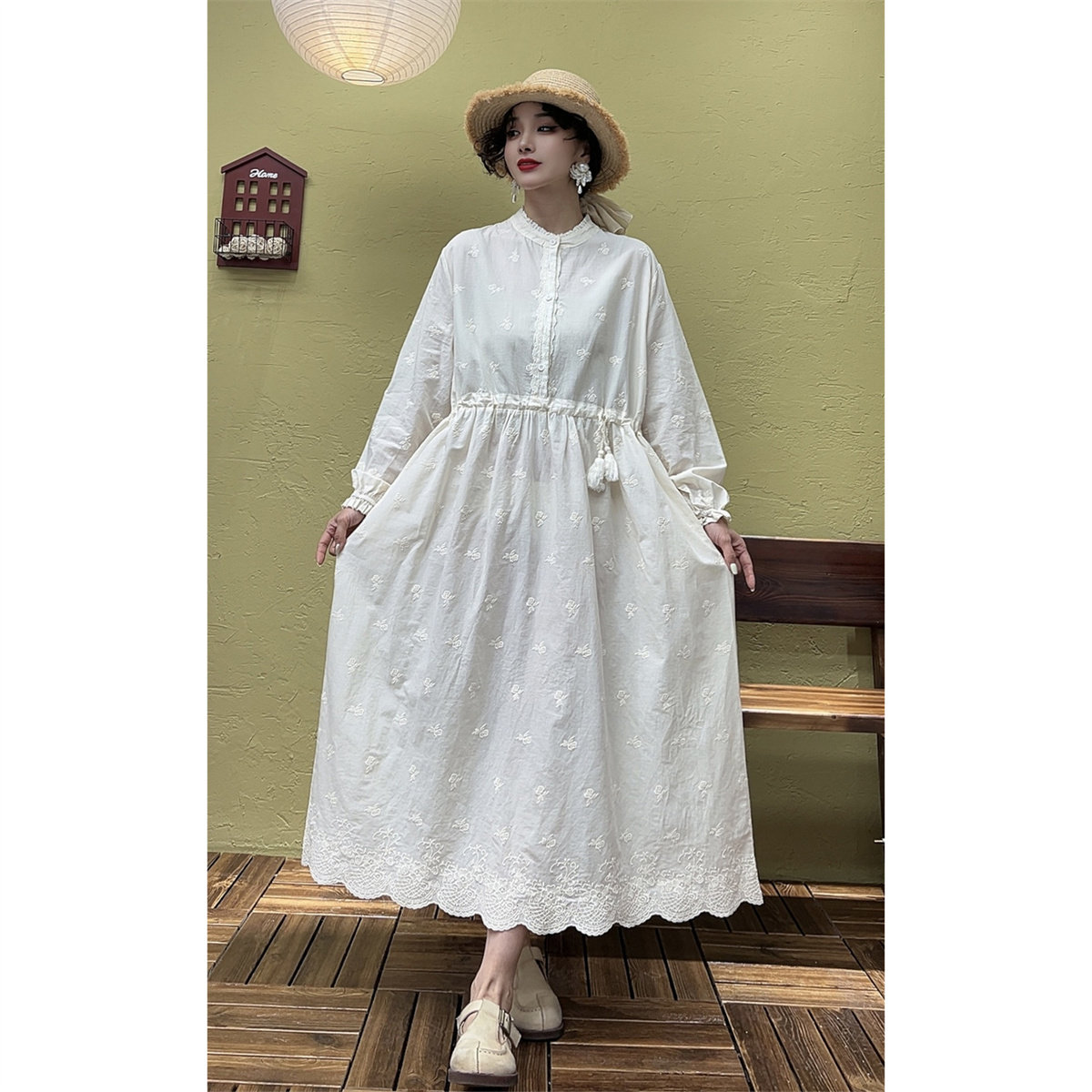 春装新复古文艺刺绣棉拼接花边系带连衣裙女宽松显瘦纯色A字长裙