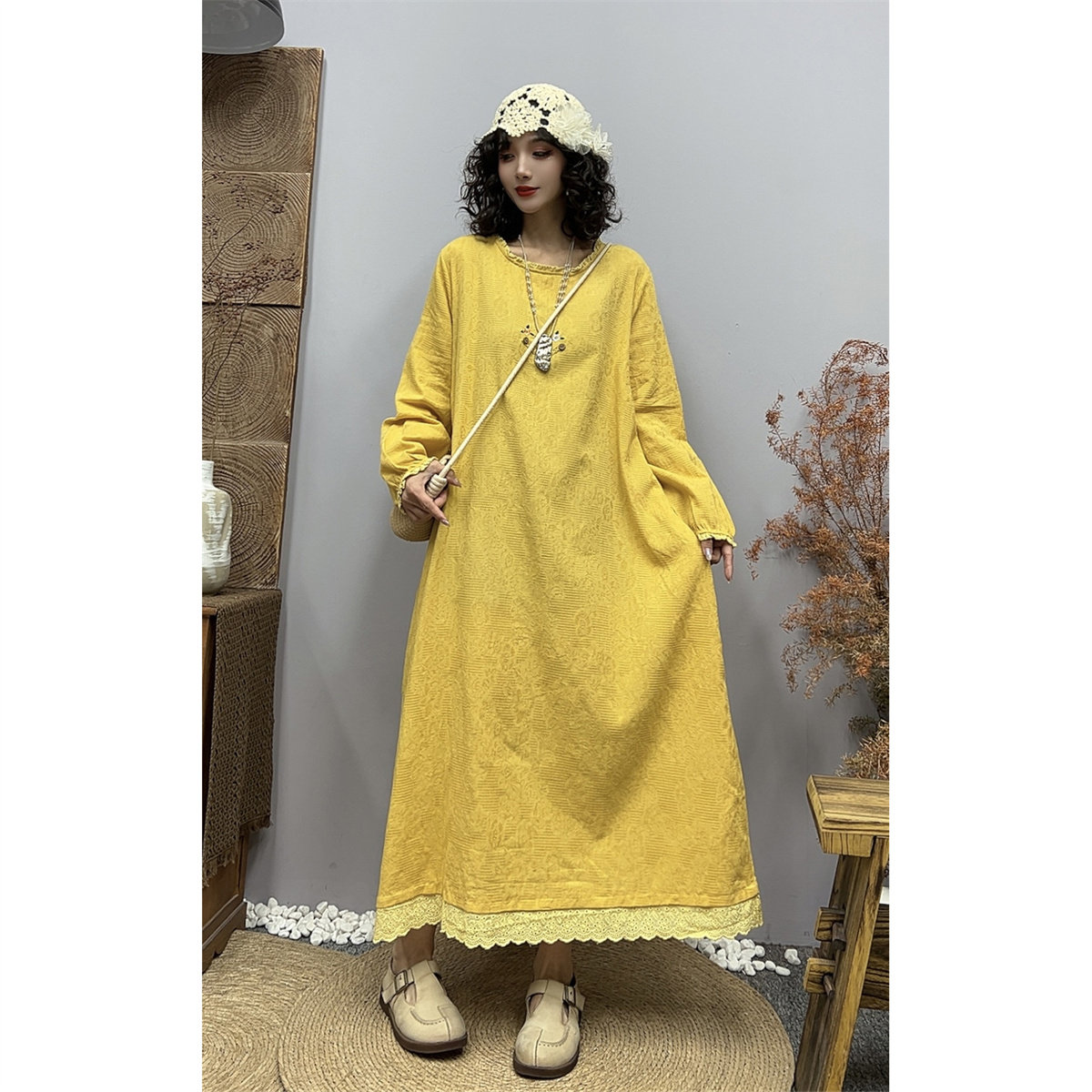 春装新复古棉麻提花长袖圆领刺绣连衣裙宽松显瘦拼花边A字长裙女