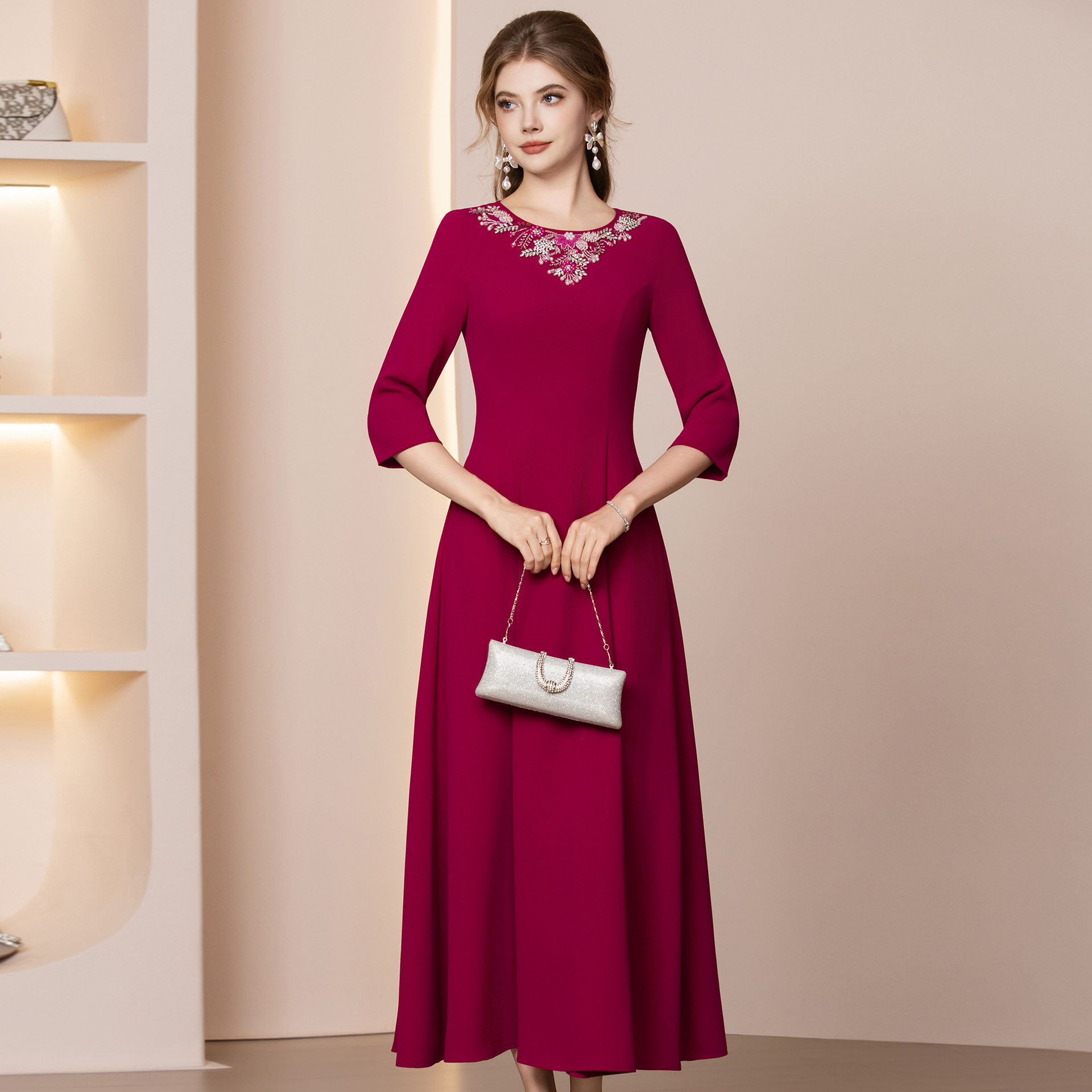 智丽红色连衣裙2026年新款春装重要场合精致钉钻长款收腰A字裙子