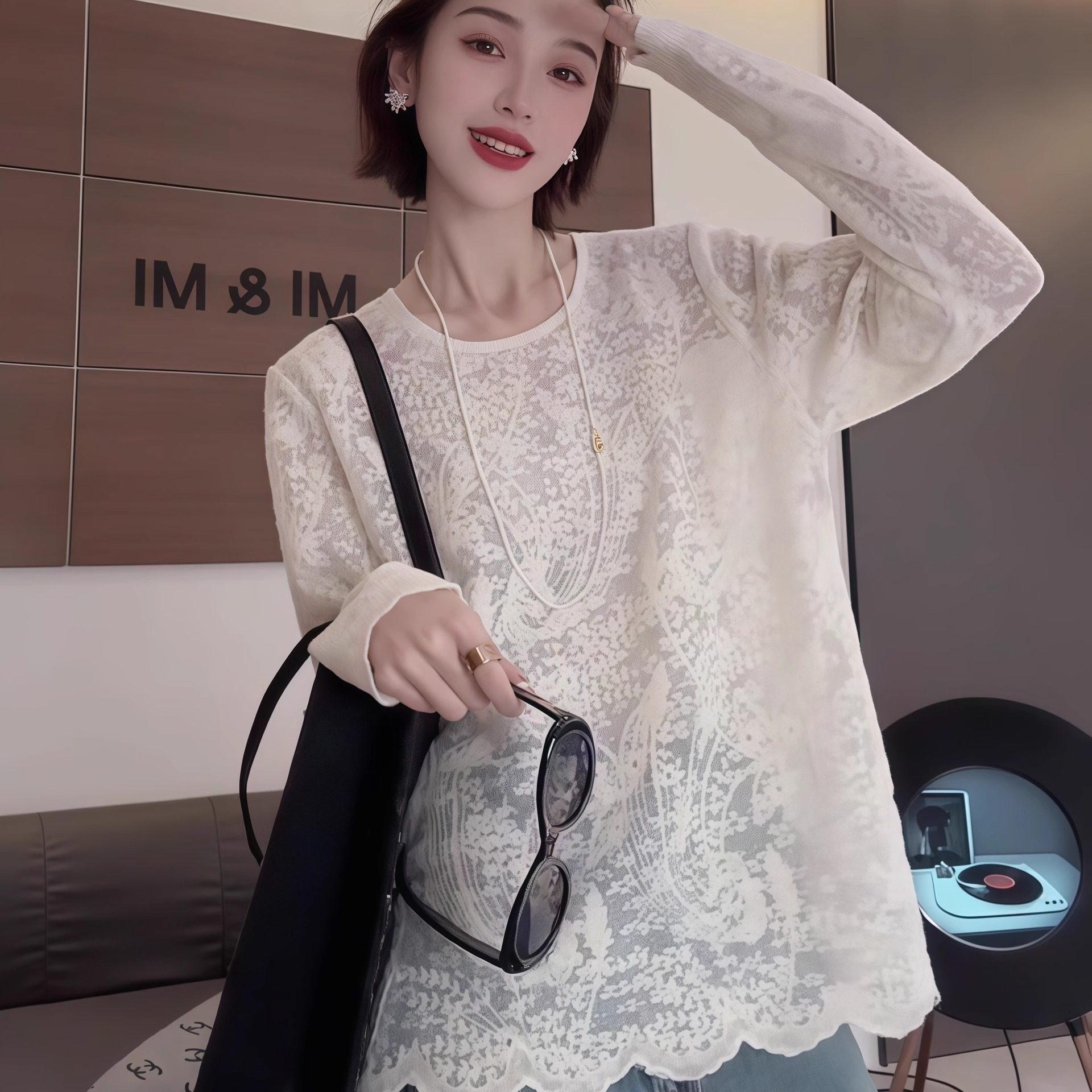 圆领套头长袖睫毛蕾丝钩花宽松版打底上衣性感百搭镂空内搭罩衫女