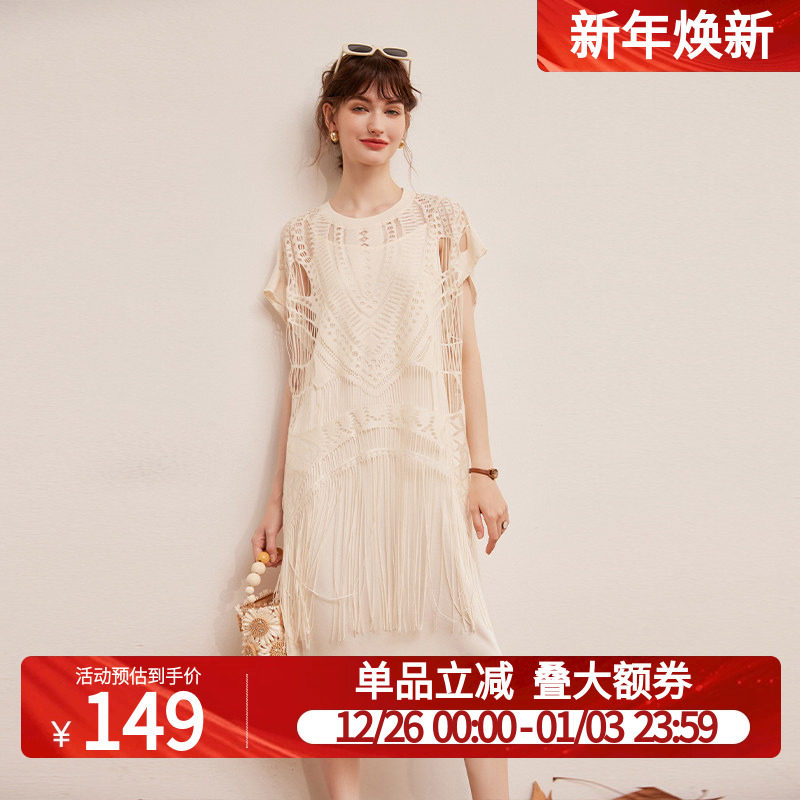 白鹿语镂空蕾丝流苏罩衫两件套2025夏季优雅吊带连衣裙女式套装