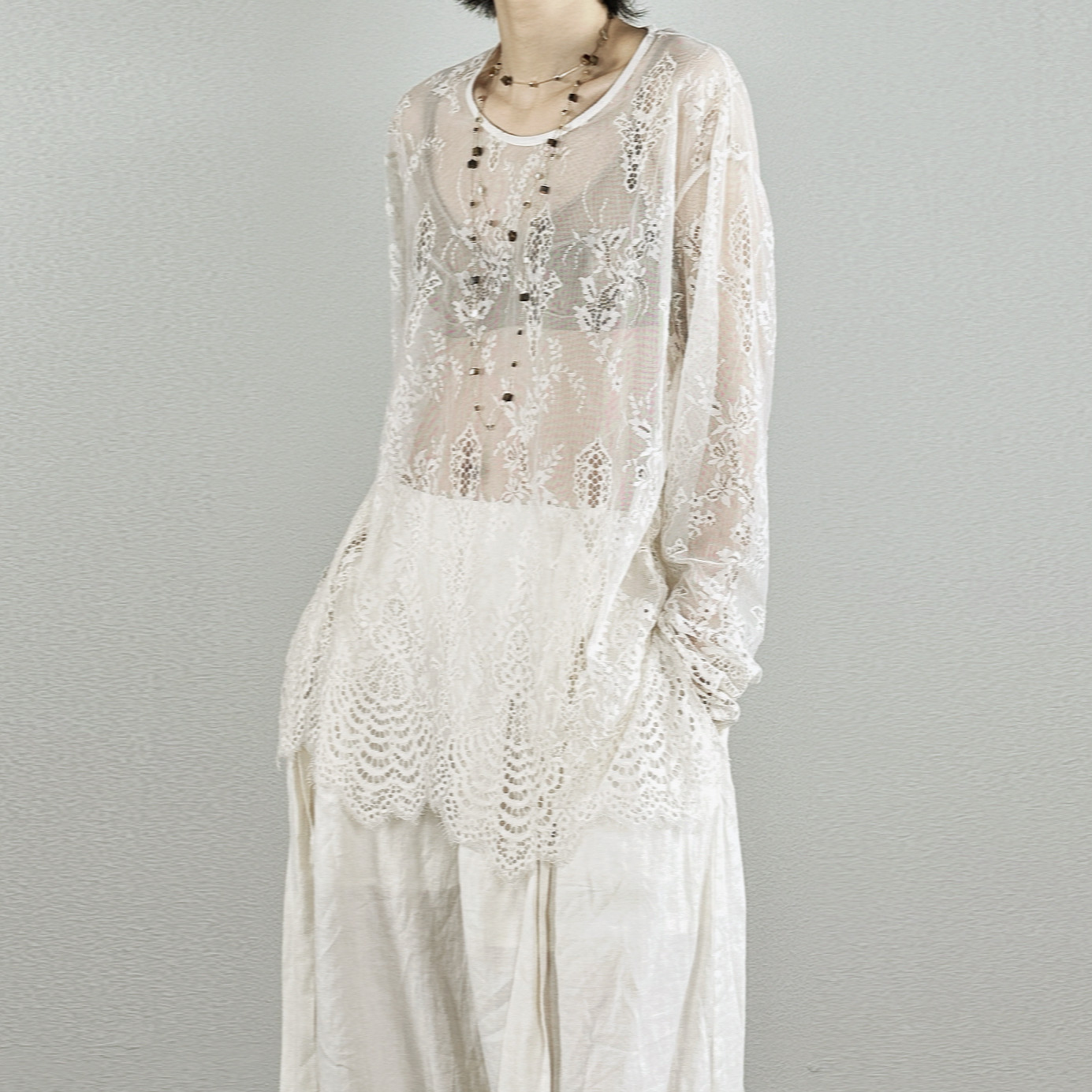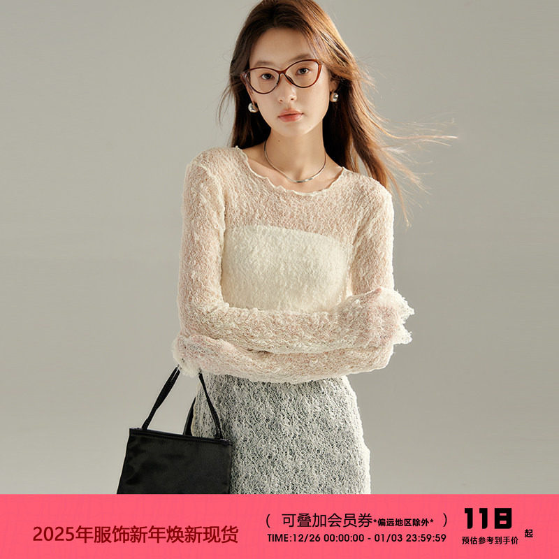 尢系UXI 2025早秋纯欲风优雅蕾丝镂空内搭叠穿圆领宽松打底罩衫
