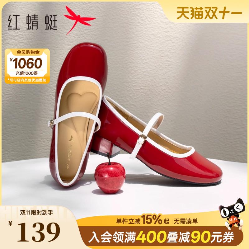 红蜻蜓红色玛丽珍2025新款女鞋婚鞋法式粗跟绝美小香风单鞋女皮鞋