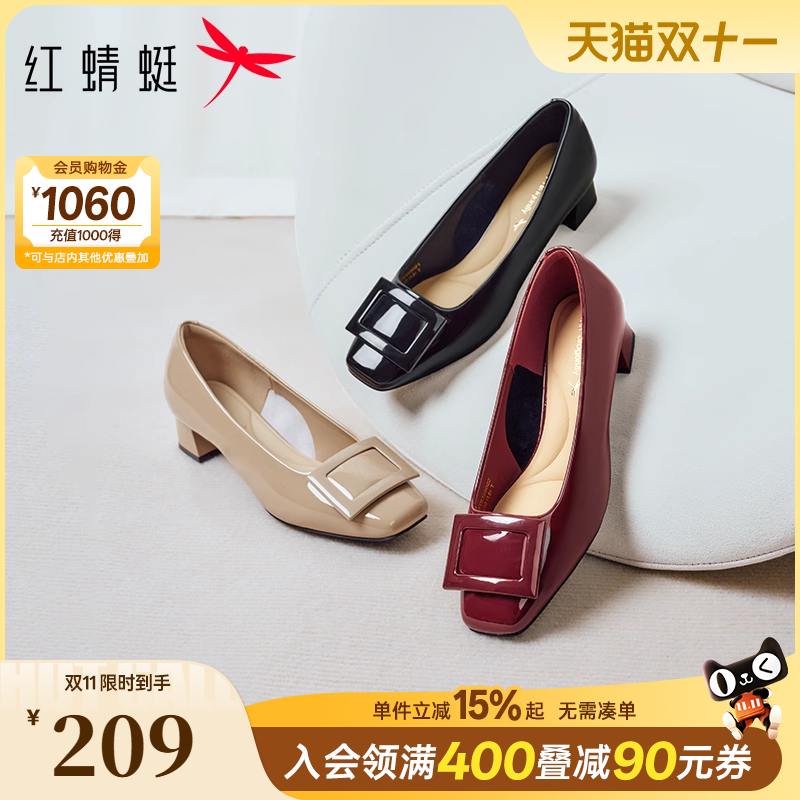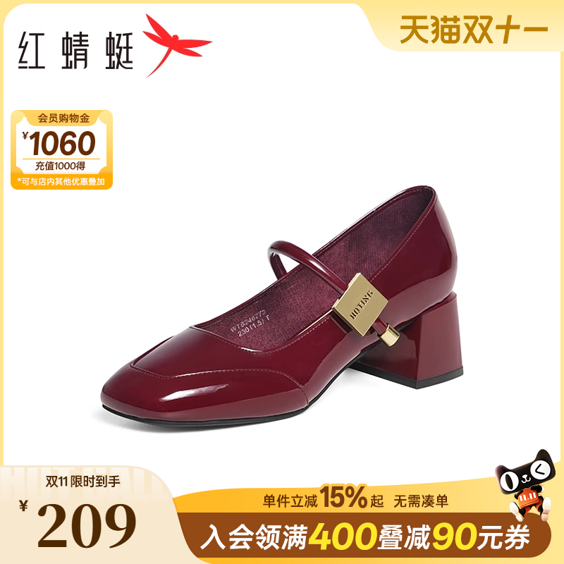 红蜻蜓红色高跟鞋2025秋新款女鞋婚鞋粗跟单鞋法式气质玛丽珍皮鞋