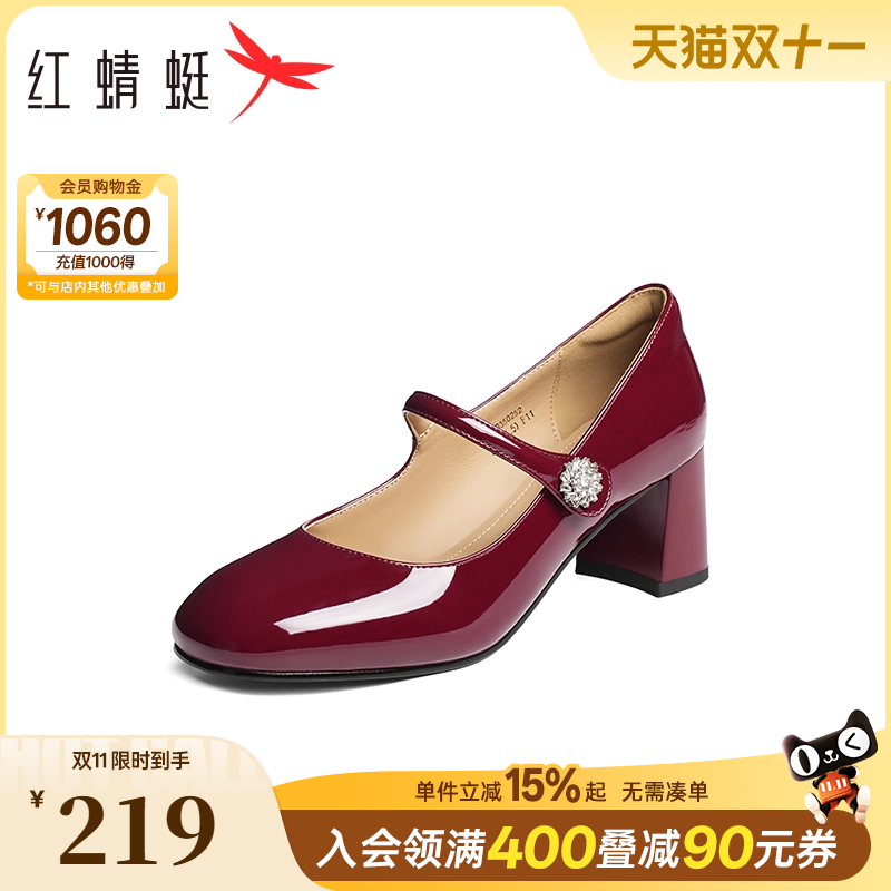 红蜻蜓红色玛丽珍女鞋2025新款粗跟单鞋不累脚高跟鞋法式婚鞋皮鞋