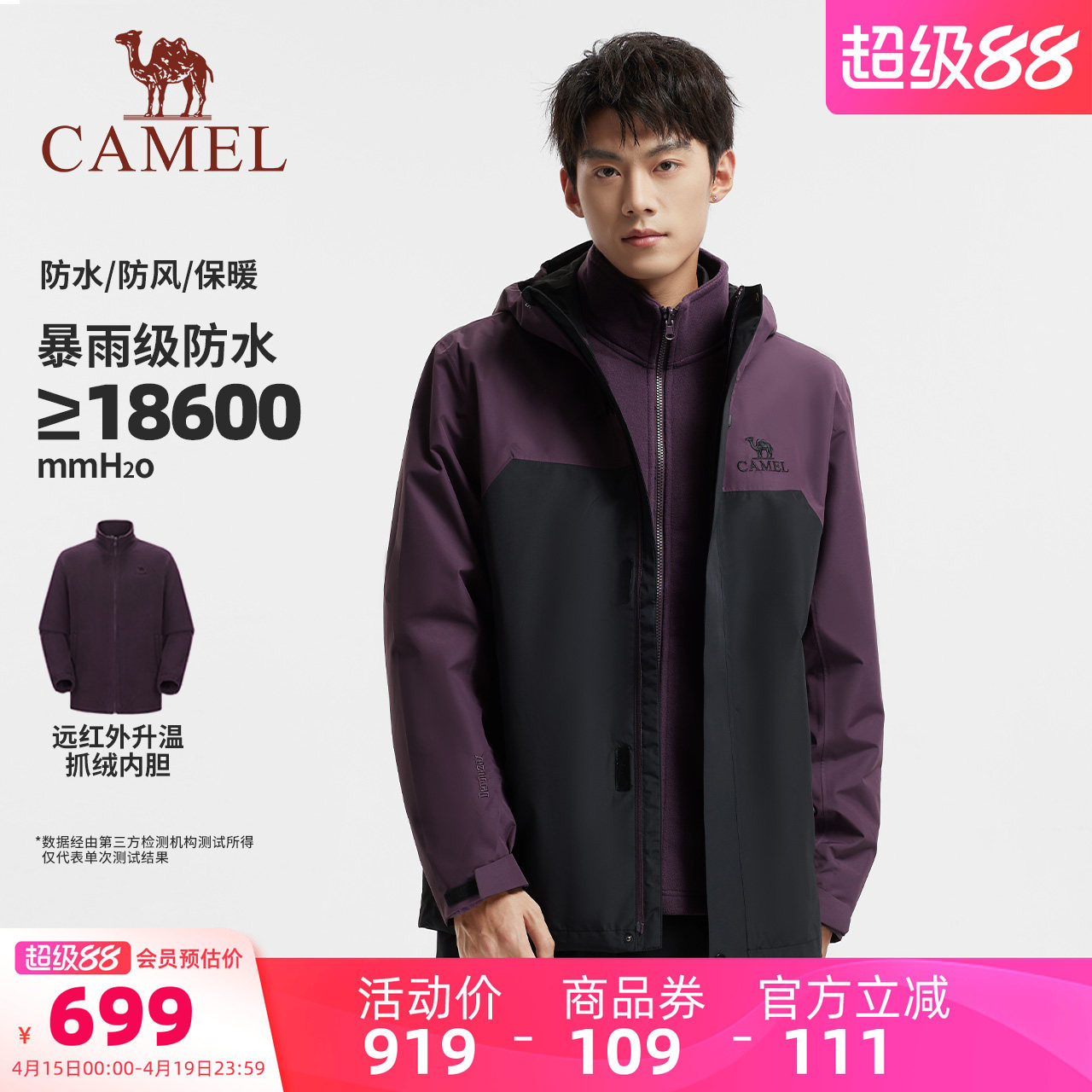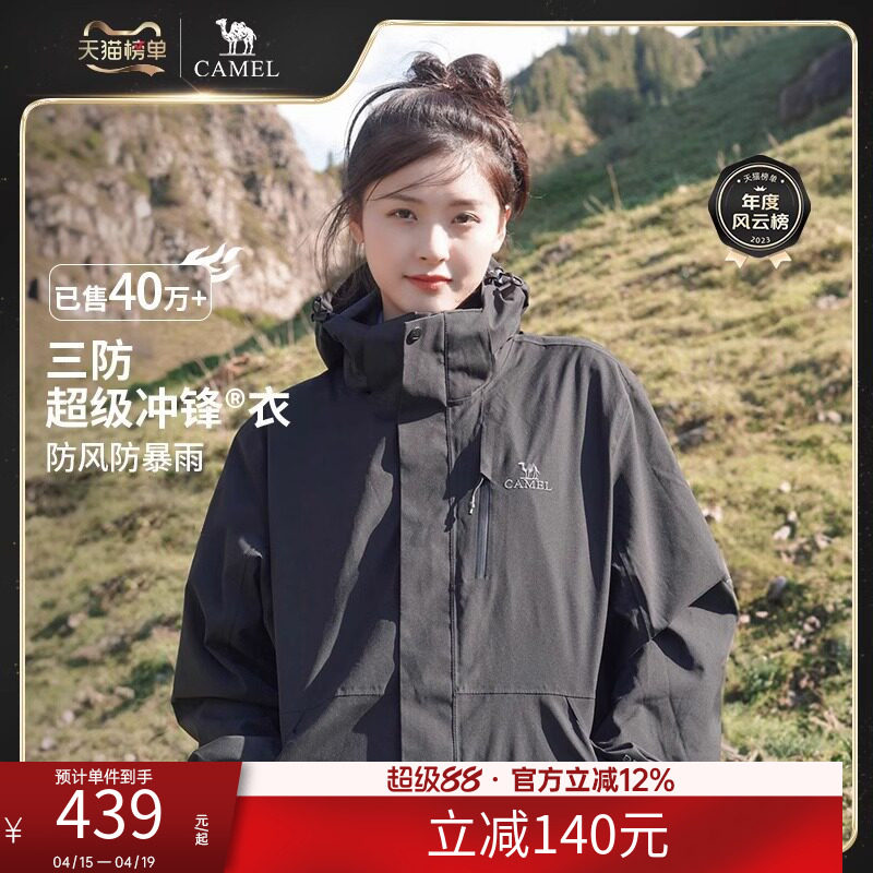 骆驼男装冲锋衣三合一防暴雨户外夹克男外套内胆登山新款徒步透气