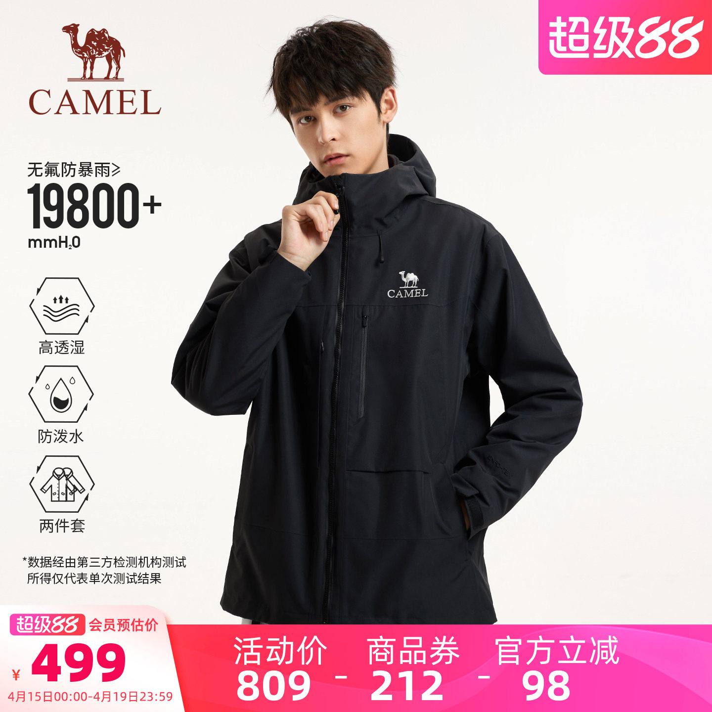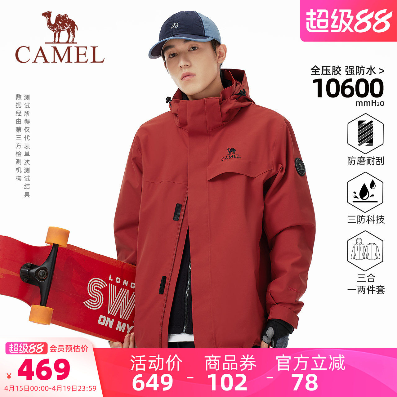 骆驼环保无氟防水防风冲锋衣男三合一户外登山外套专业全压胶透气