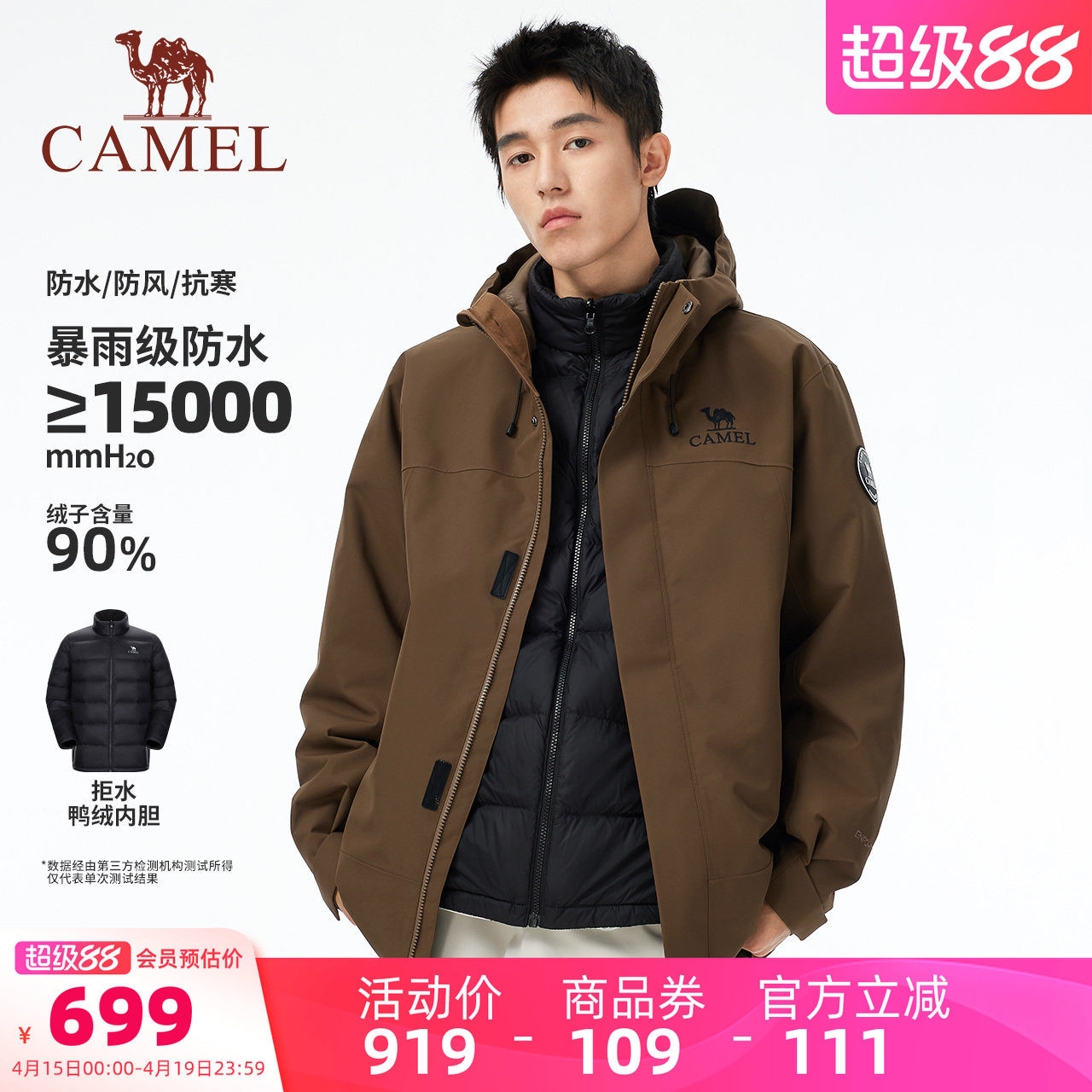 骆驼环保无氟防水冲锋衣男三合一户外新款登山外套专业全压胶透气