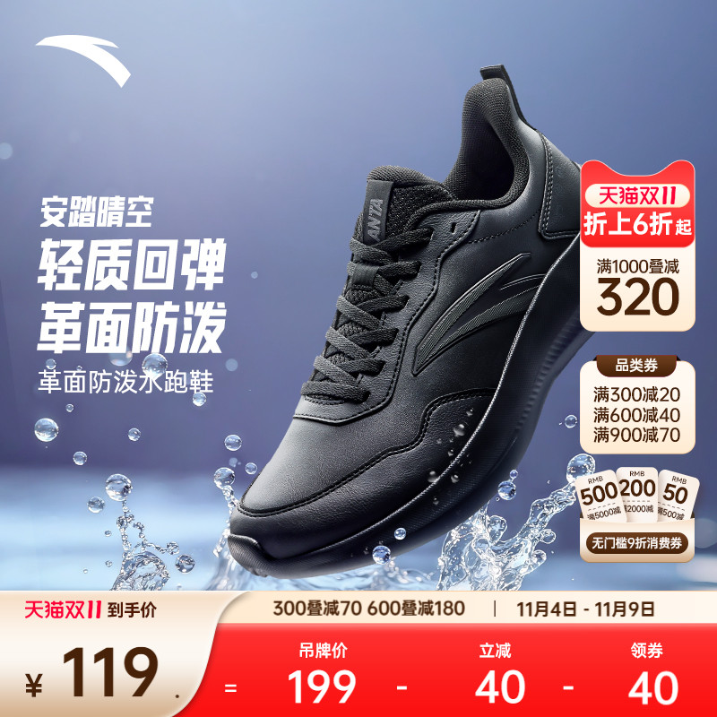 安踏男鞋运动鞋男款皮面防水跑步鞋子男士官方旗舰黑色休闲跑鞋男