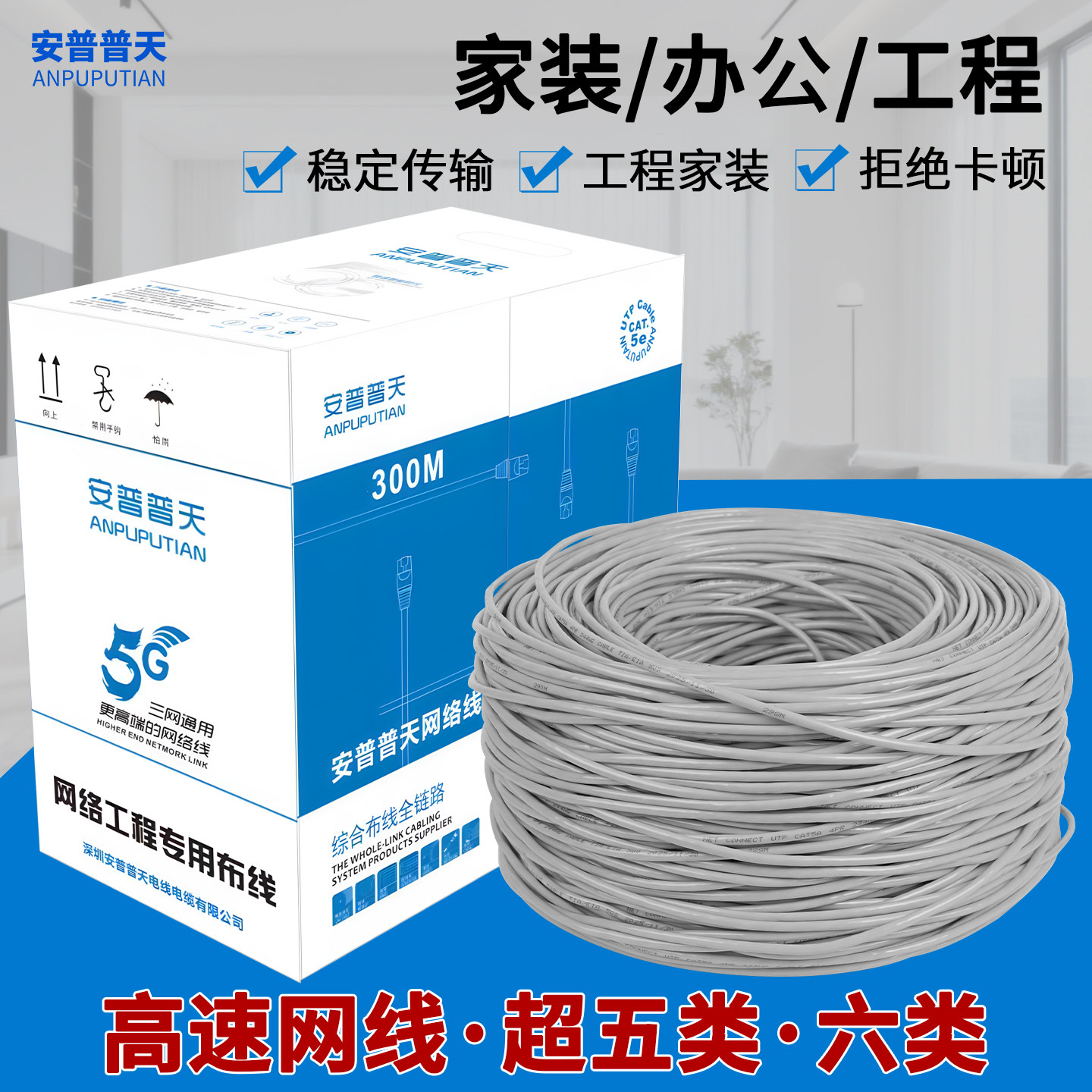 安普华通信超五类网线千兆纯铜电脑监控线5类无氧铜家用网线300米