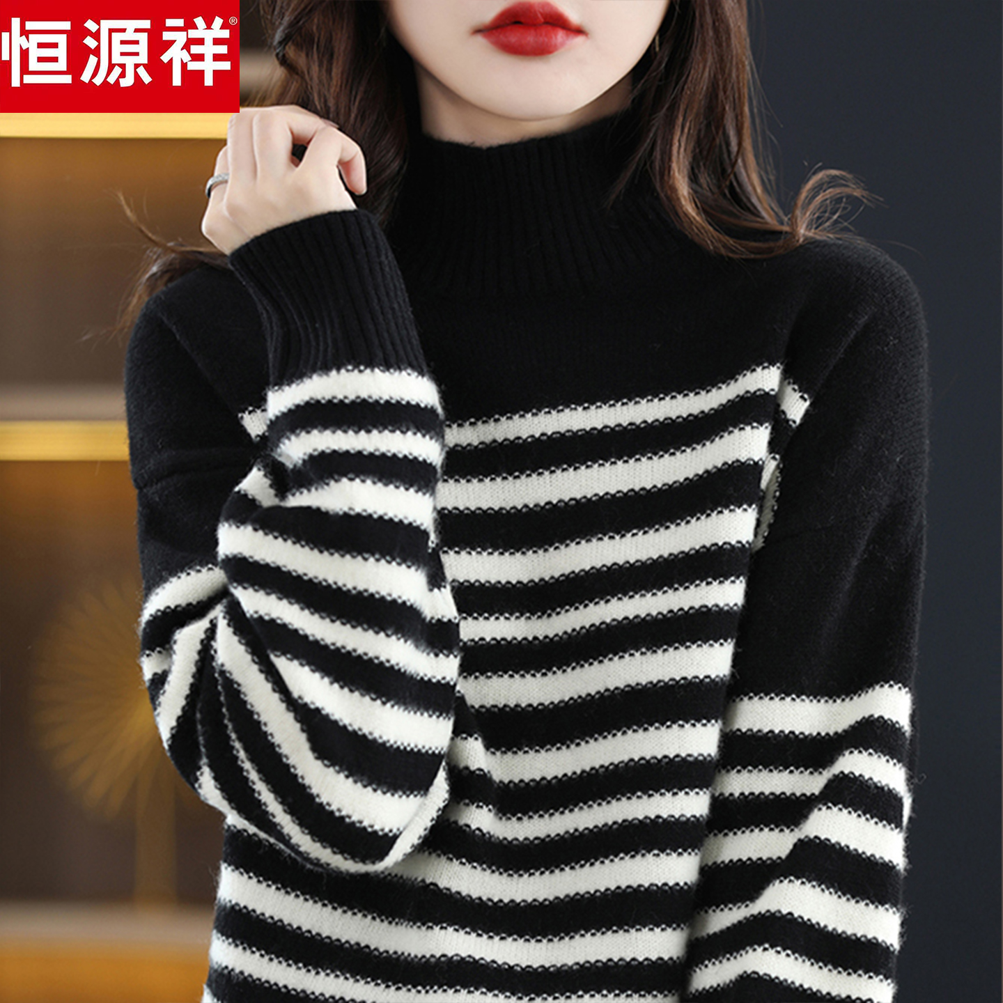 恒源祥半高领羊毛衫女秋冬宽松条纹针织打底衫外搭上衣加厚毛衣潮