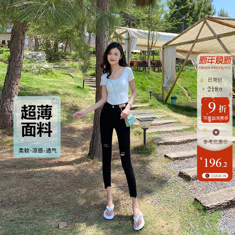 显瘦纯黑色破洞高腰小脚牛仔裤女夏季超薄款辣妹修身九分铅笔裤子