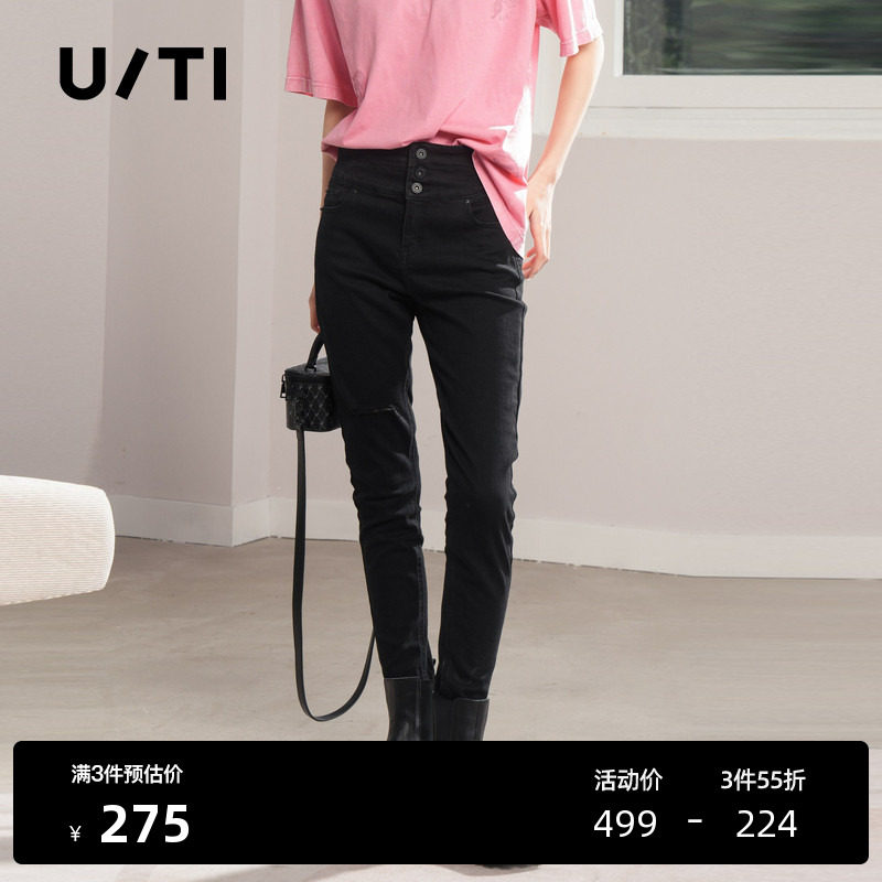 U/TI黑色高腰破洞小脚裤女百搭设计感弹力牛仔裤尤缇时尚秋季新款