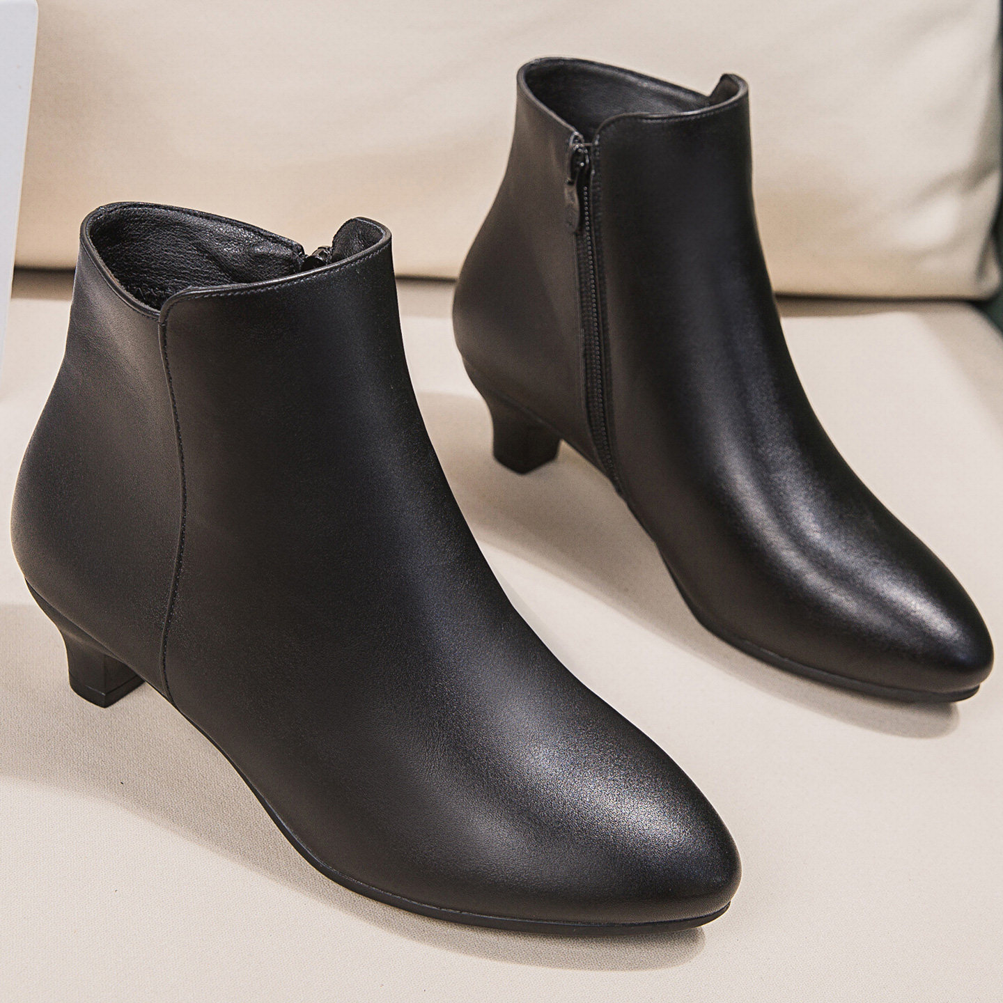 秋通勤方头中跟4cm黑皮鞋软底粗跟黑色短靴女冬季工作鞋短筒靴子