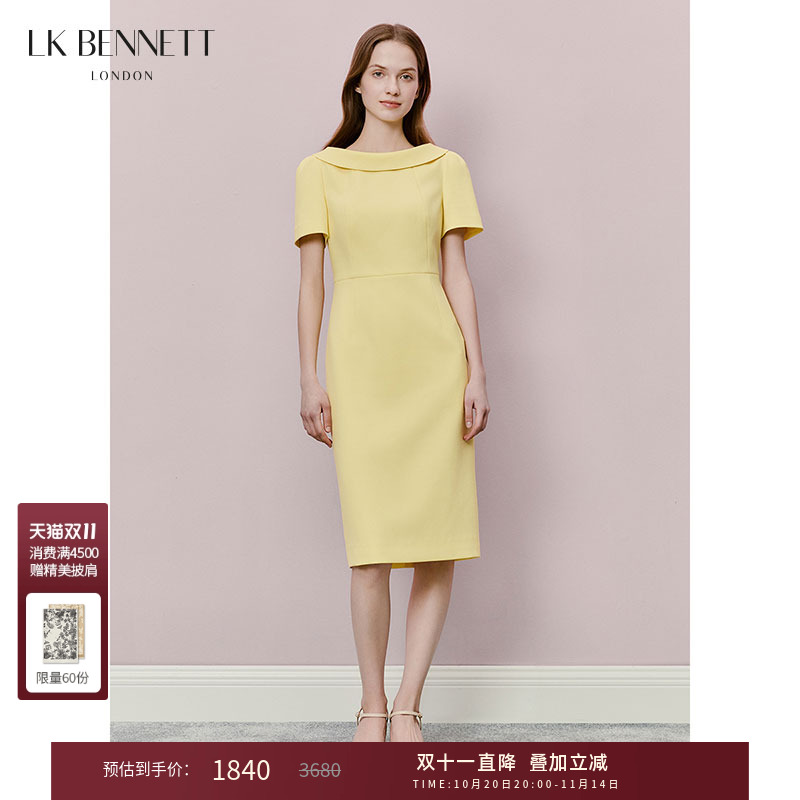 lkbennett黄色正装连衣裙2025年夏新款气质船领收腰显瘦中长款