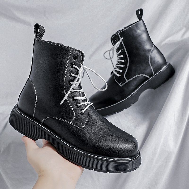 秋季马丁靴男黑色j厚底白鞋带时尚工装鞋圆头青年车缝线短筒机车