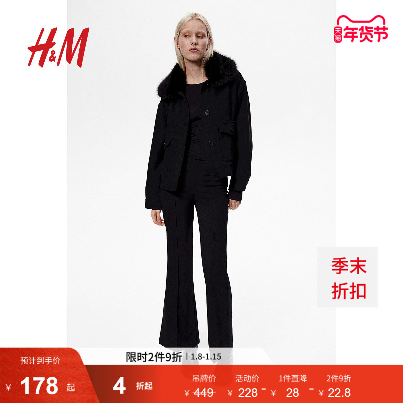HM女装短外套冬季毛茸领冬装保暖宽松长袖开衫短款大衣1250910