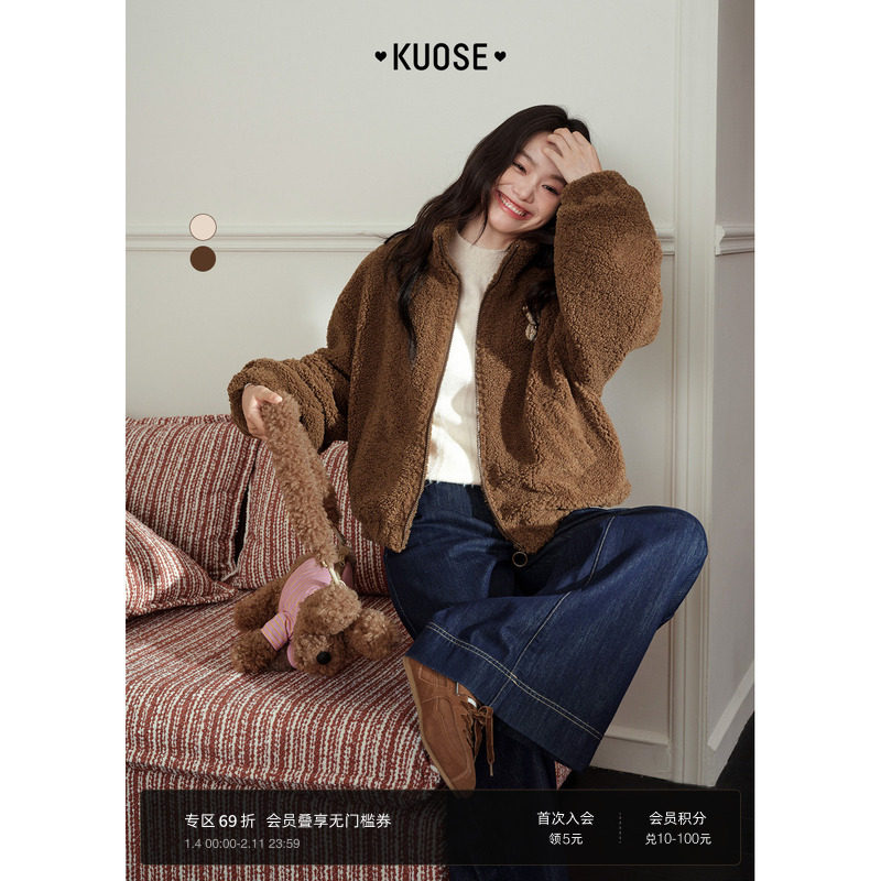 阔色仿羔毛外套宽松2025秋冬季穿搭新款女长袖翻领上衣短款含公仔